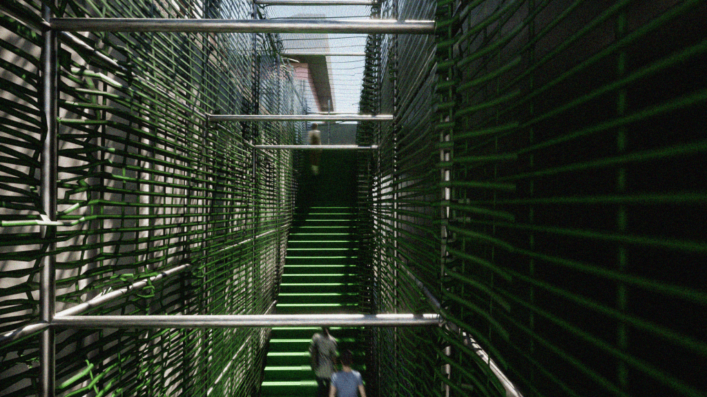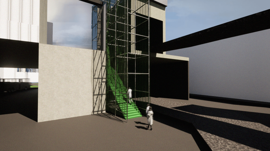 Creating a second purpose for the proposed stairs- continuing the design with harsh and geometric scaffolding structures, against vibrant and flowing board textile.