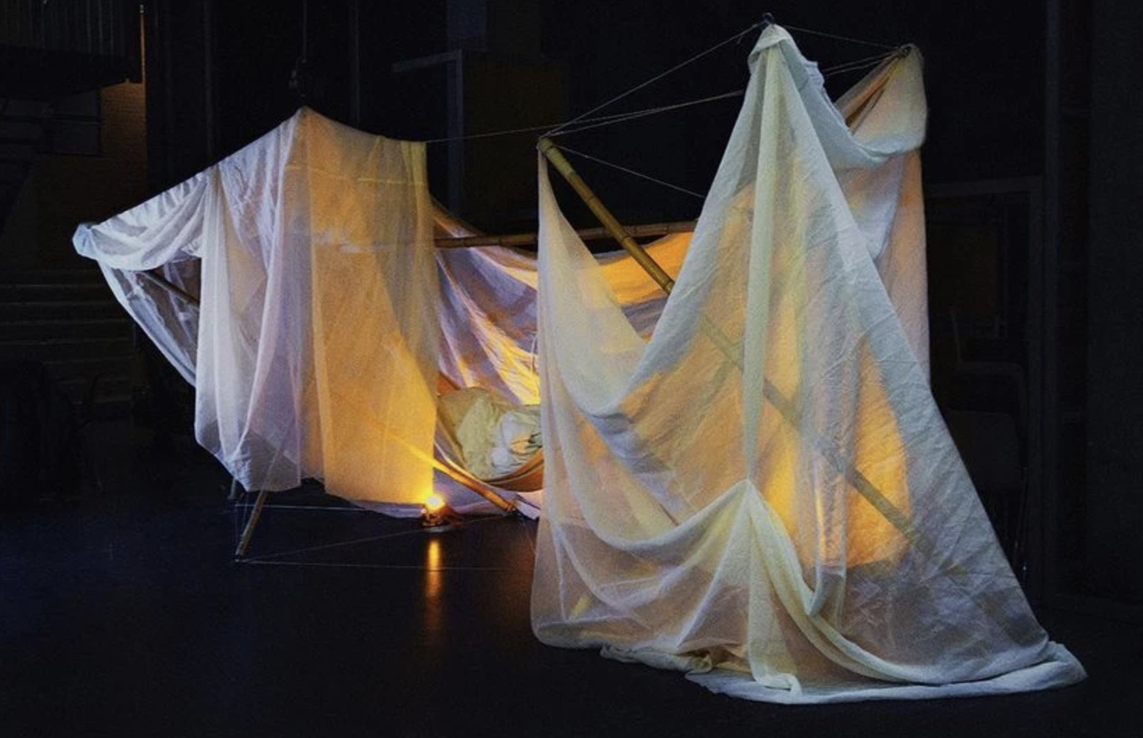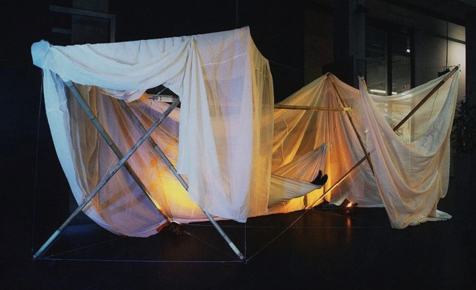 We created a dynamic and harsh structure based wholly on tensegrity, which coincides with the cold and rural feel of the parking lot (which was our chosen upon location for this temporary installation). To contrast this rural harshness, we played and experimented with the softness, elegancy, and sheerness of fabric, by draping it over the tensegrity bamboo structure. All of the bamboo used for the structure was second hand, and not cut or damaged in any way, to keep our project as sustainable as possible.